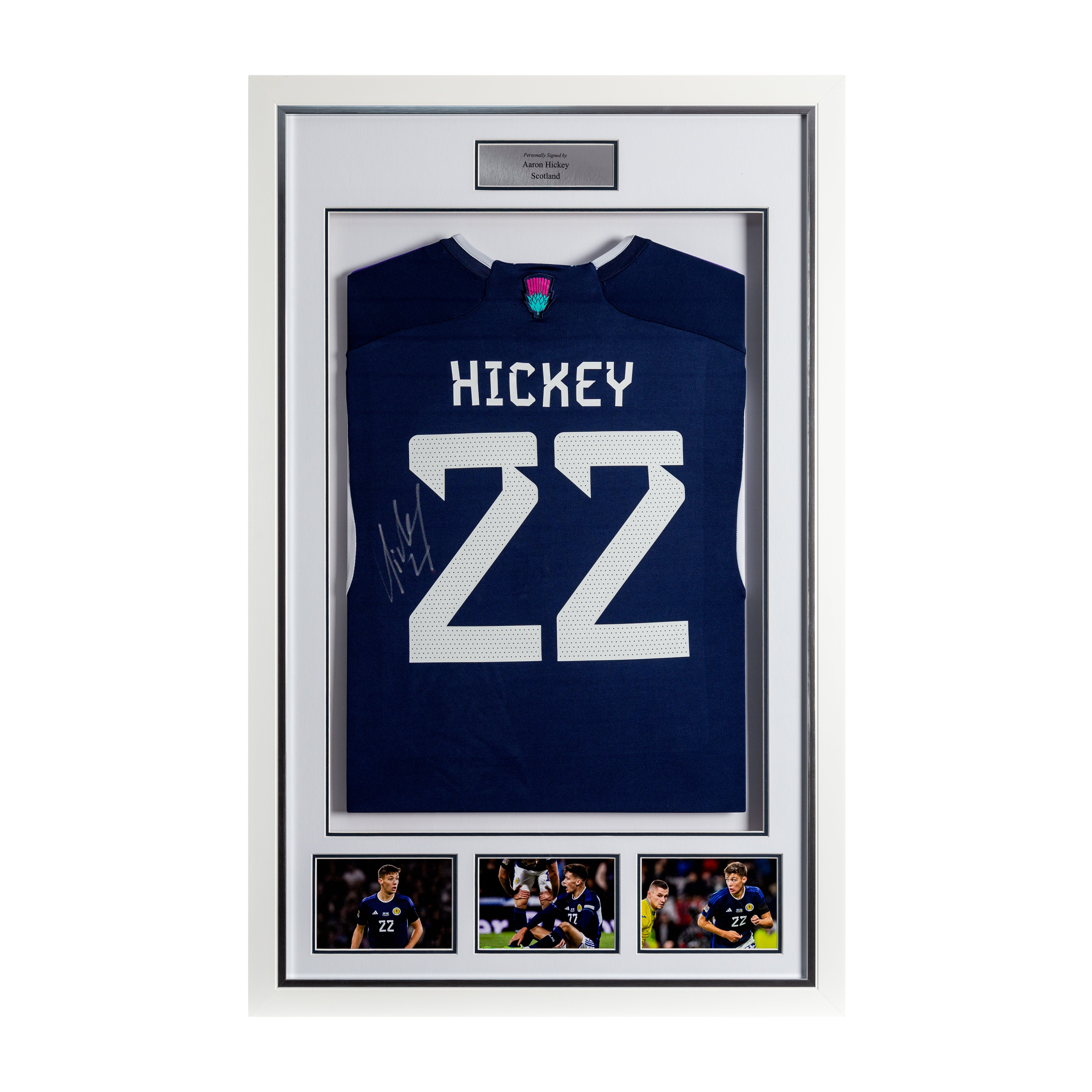 This stunning replica shirt has been hand signed by Aaron Hickey. Framed sponsor style, our most popular shirt finish, with 3 pictures and a silver plaque then finished off in a stylish and modern bespoke white with silver trim frame, making it a timeless addition to any home or office.