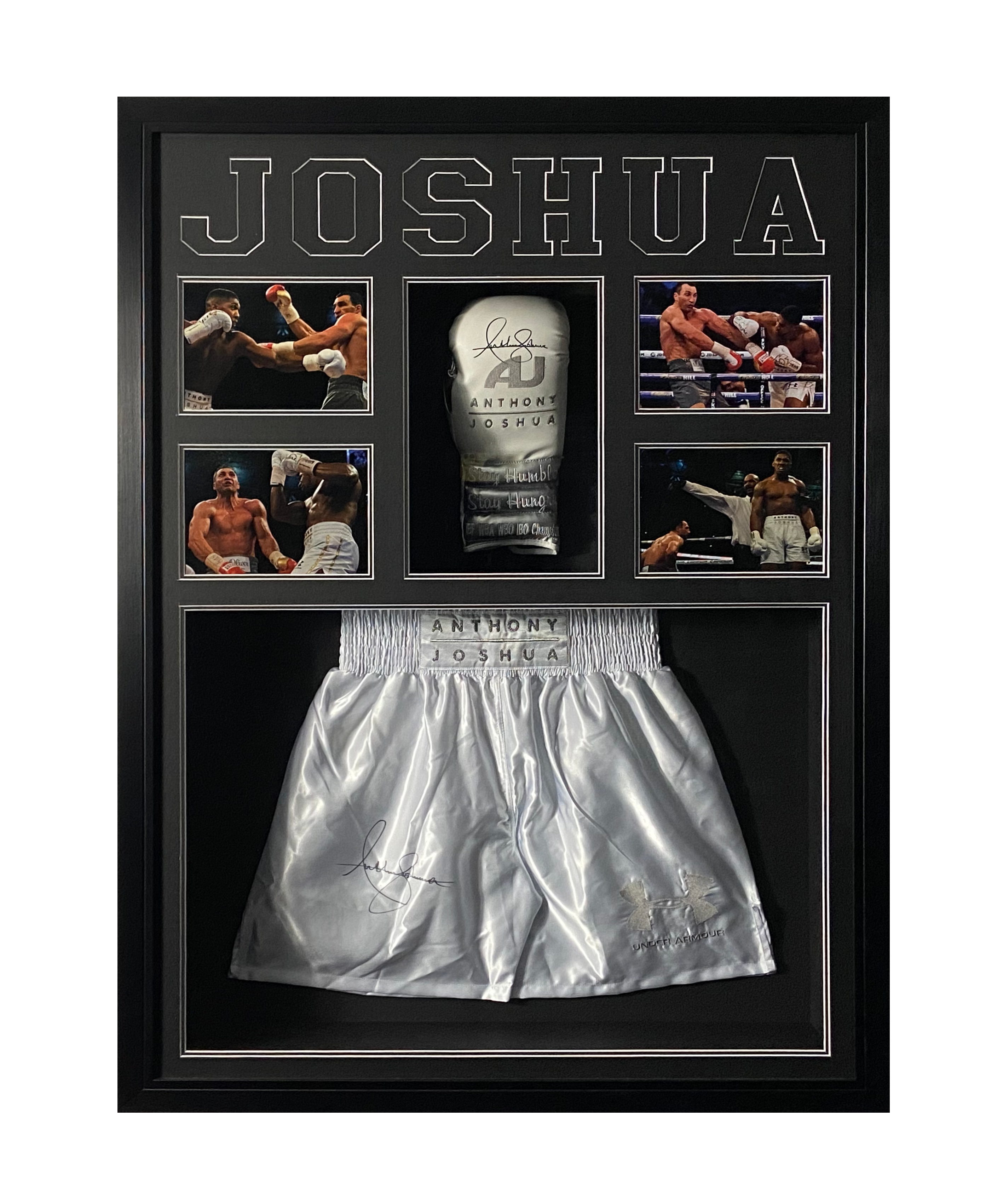 These stunning replica shorts and glove, hand signed by Anthony Joshua, have been put together in this stunning combi with montage of pictures and a name cut, and finished off in a stylish and modern bespoke black on black trim frame, making it a timeless addition to any home or office.