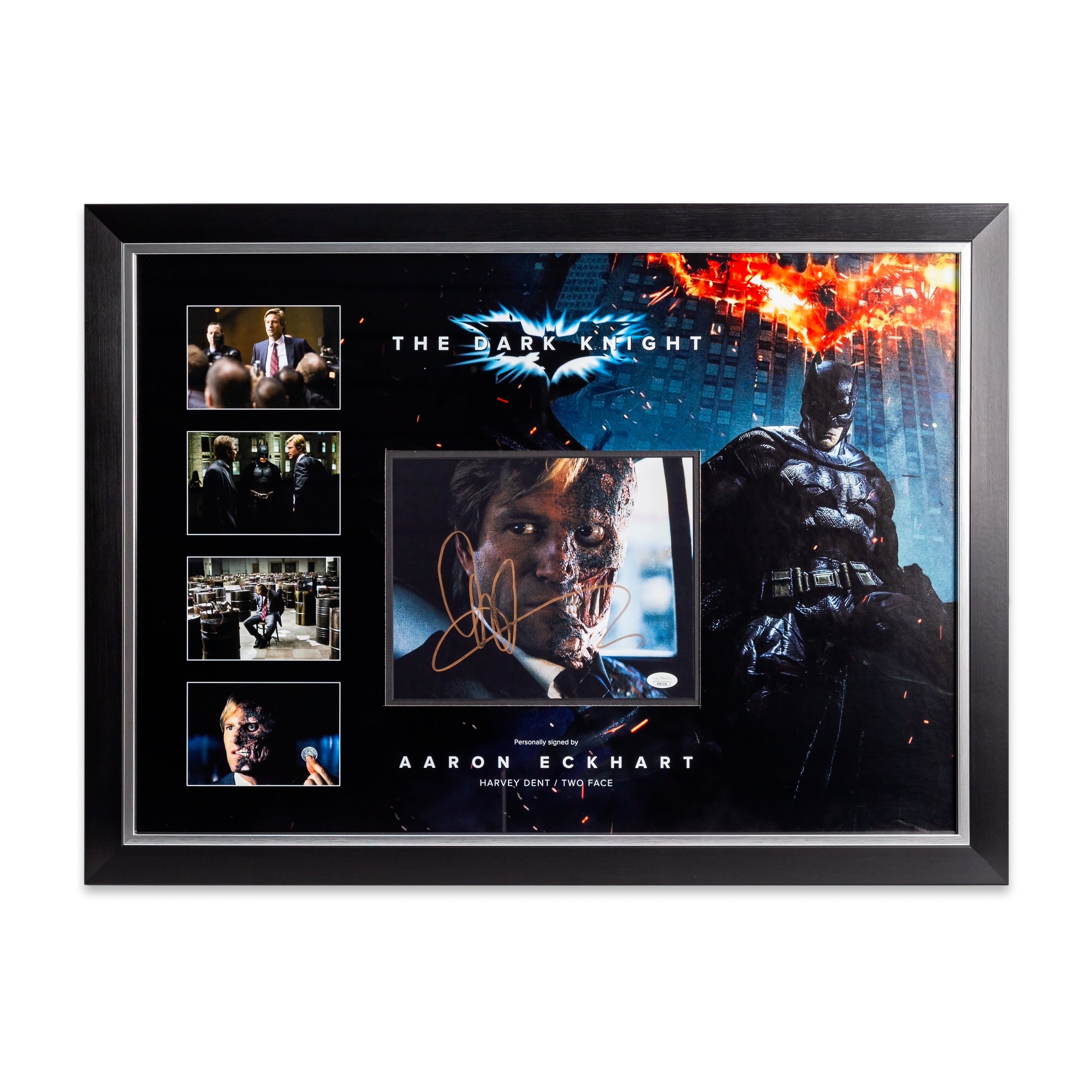 This stunning "The Dark Knight" picture, hand signed by Aaron Eckhart, is mounted on a custom-made picture board display which is designed in-house by our design team, and finished off in a stylish and modern bespoke black on black trim frame, making it a timeless addition to any home or office.