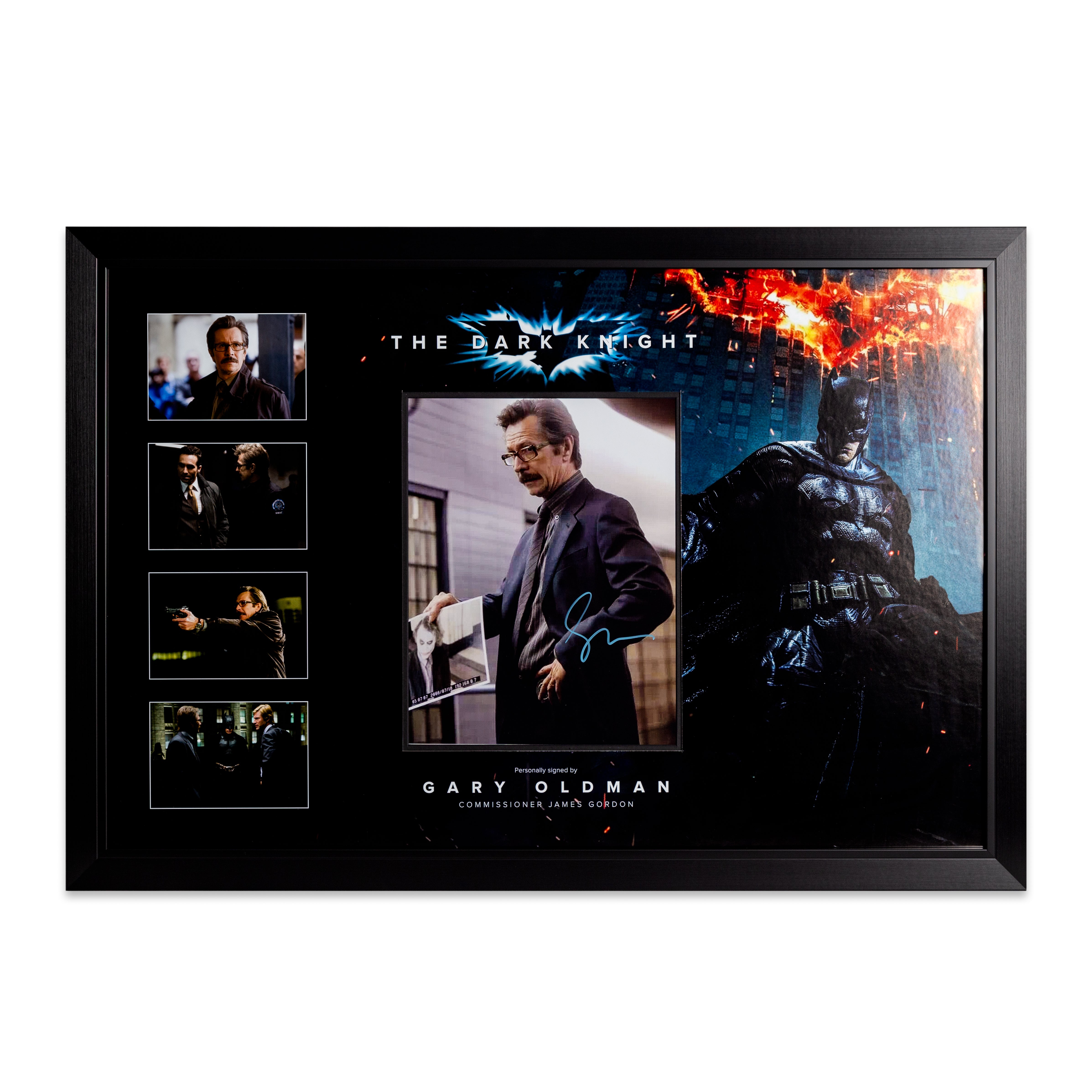 This stunning "The Dark Knight" picture, hand signed by Gary Oldman, is mounted on a custom-made picture board display which is designed in-house by our design team, and finished off in a stylish and modern bespoke black with silver trim frame, making it a timeless addition to any home or office.