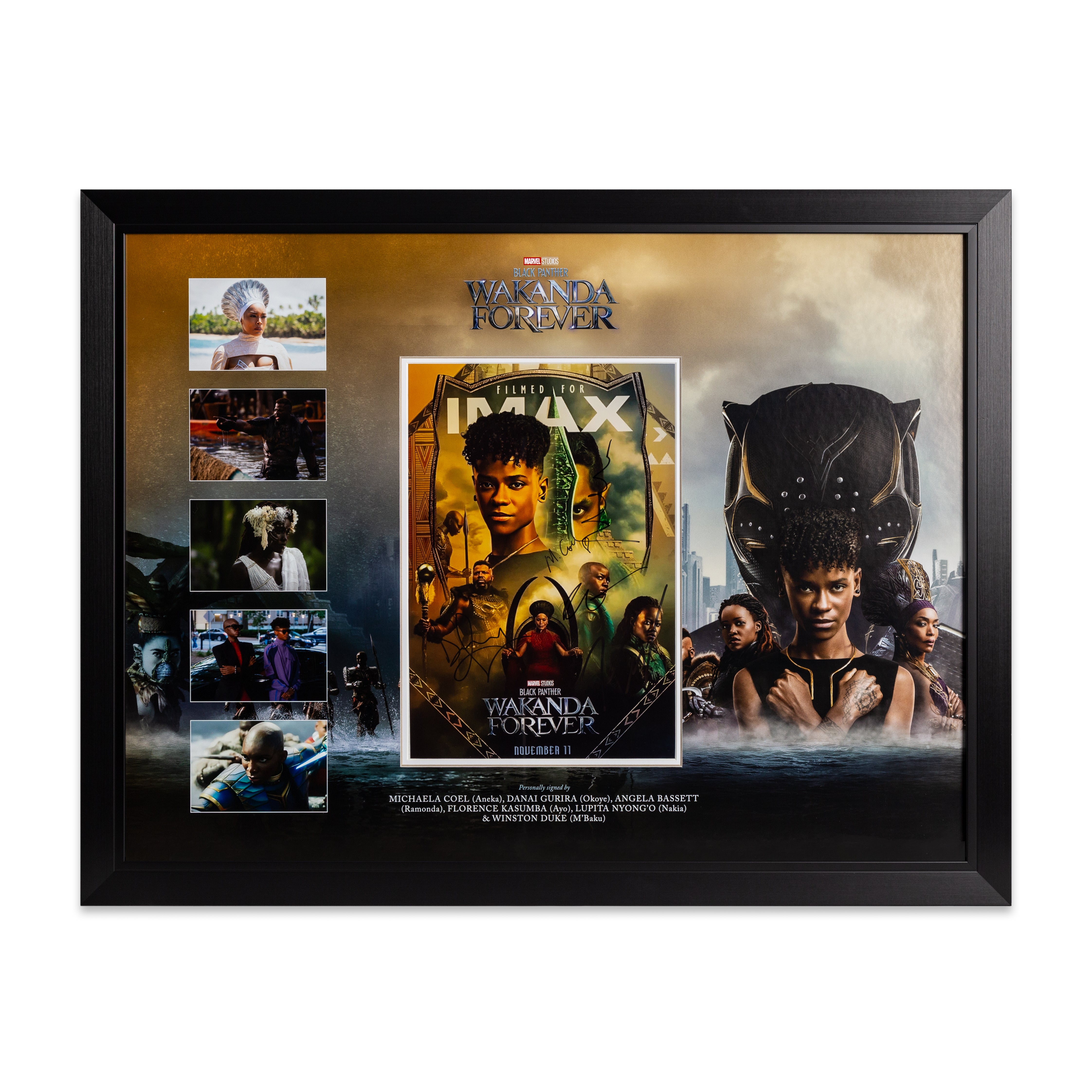 This stunning "Black Panther Wakanda Forever" picture, hand signed by The Cast, is mounted on a custom-made picture board display which is designed in-house by our design team, and finished off in a stylish and modern bespoke black frame, making it a timeless addition to any home or office.