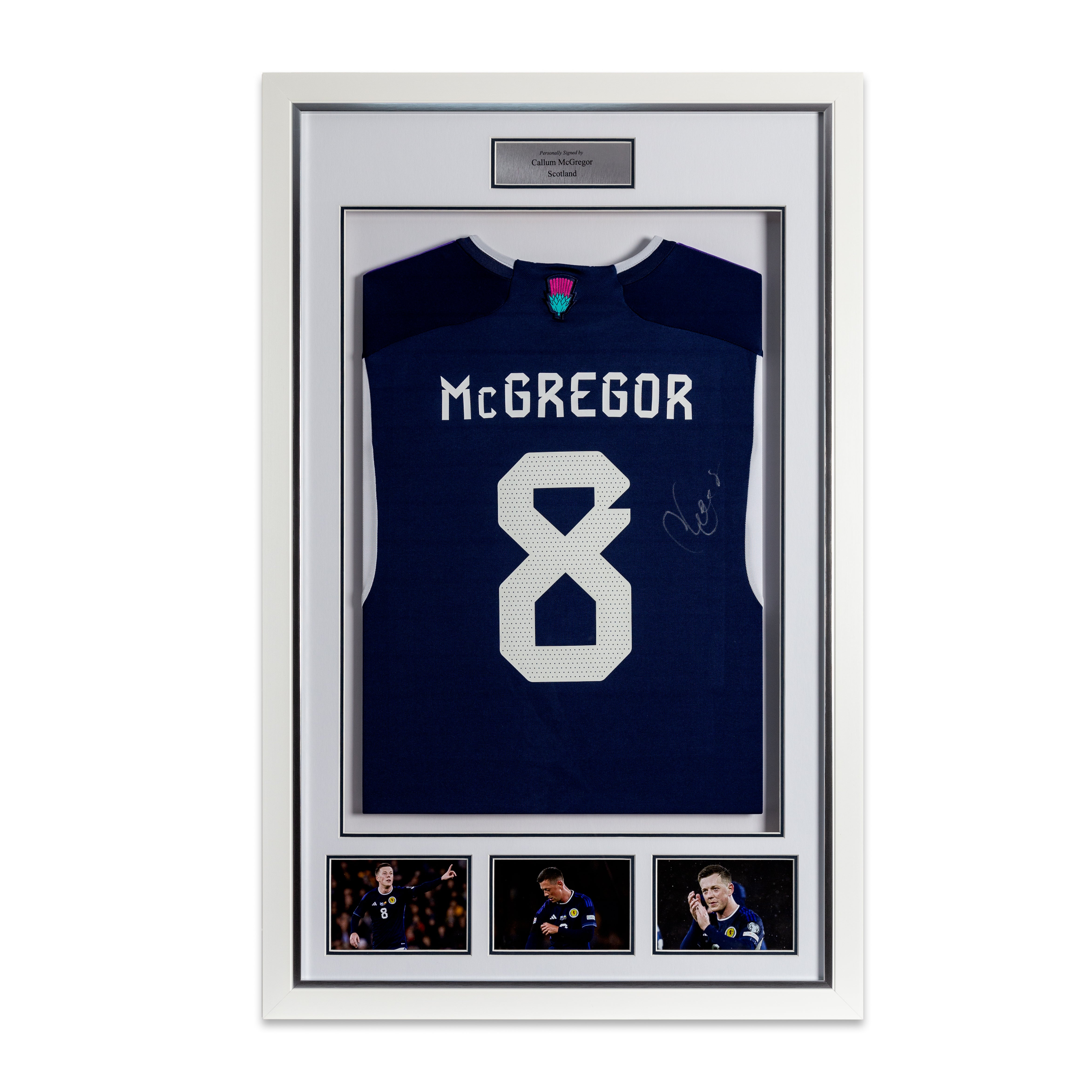 This stunning replica shirt has been hand signed by Callum McGregor. Framed sponsor style, our most popular shirt finish, with 3 pictures and a silver plaque then finished off in a stylish and modern bespoke white with silver trim frame, making it a timeless addition to any home or office.