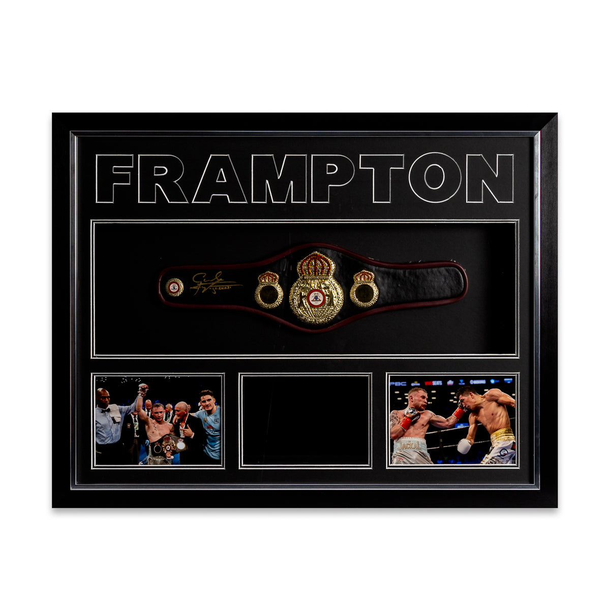 This stunning replica Belt, hand signed by Carl Frampton, is mounted in a box, and finished off in a stylish and modern bespoke black and silver trim frame, making it a timeless addition to any home or office.