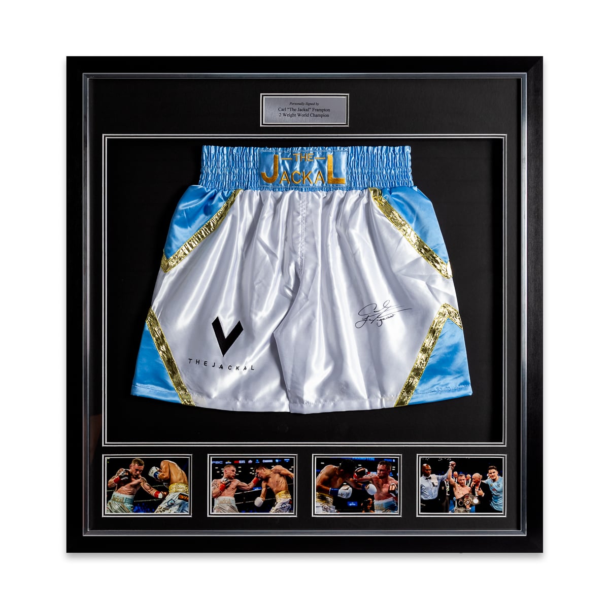 These stunning shorts hand signed by Carl Frampton , is made with a frame and picture collection which is designed in-house by our design team, and finished off in a stylish and modern bespoke black and silver trim frame, making it a timeless addition to any home or office.
