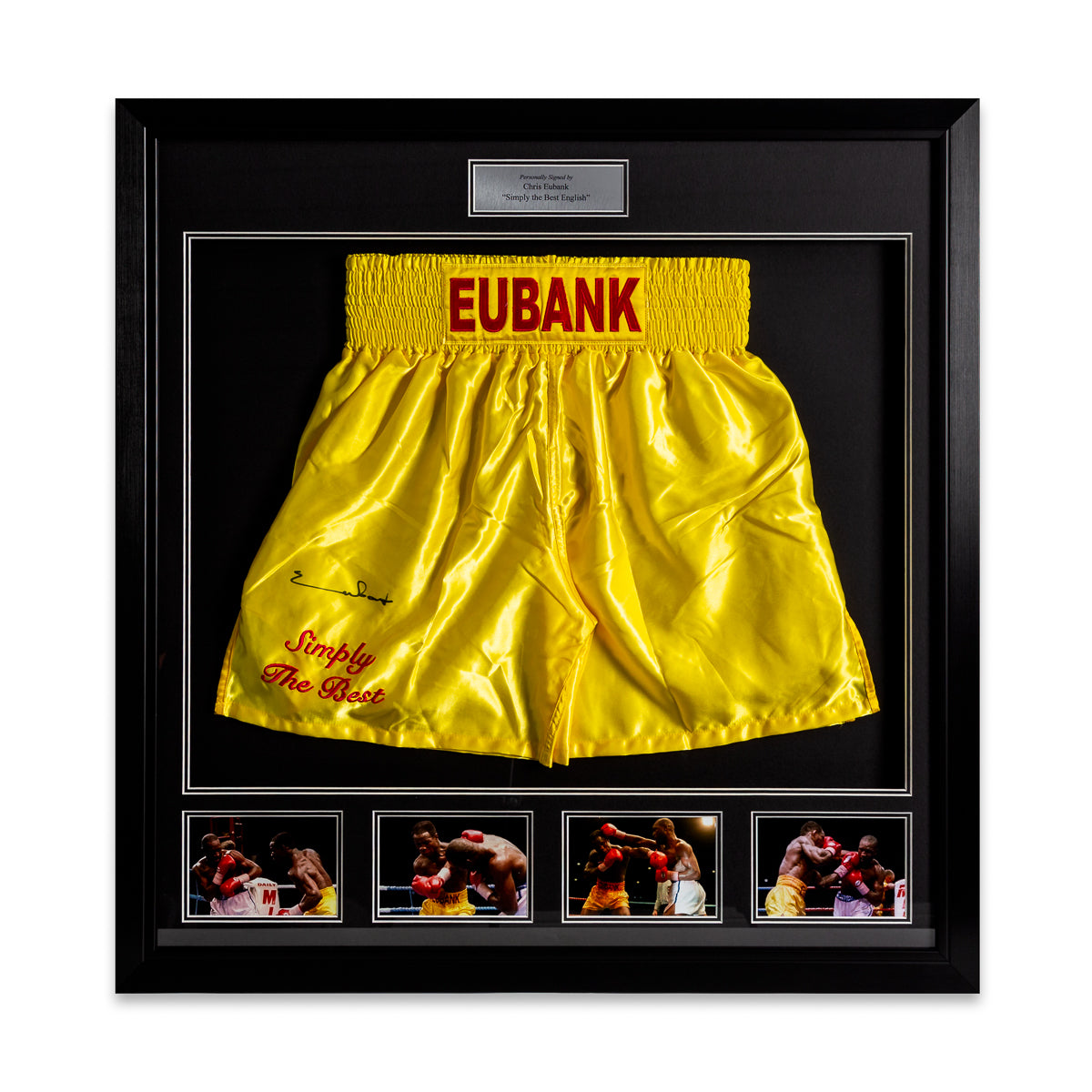 These stunning Replica Shorts, Hand Signed by Chris Eubank, is made with a frame and picture collection which is designed in-house by our design team, and finished off in a stylish and modern bespoke black and silver trim frame, making it a timeless addition to any home or office.