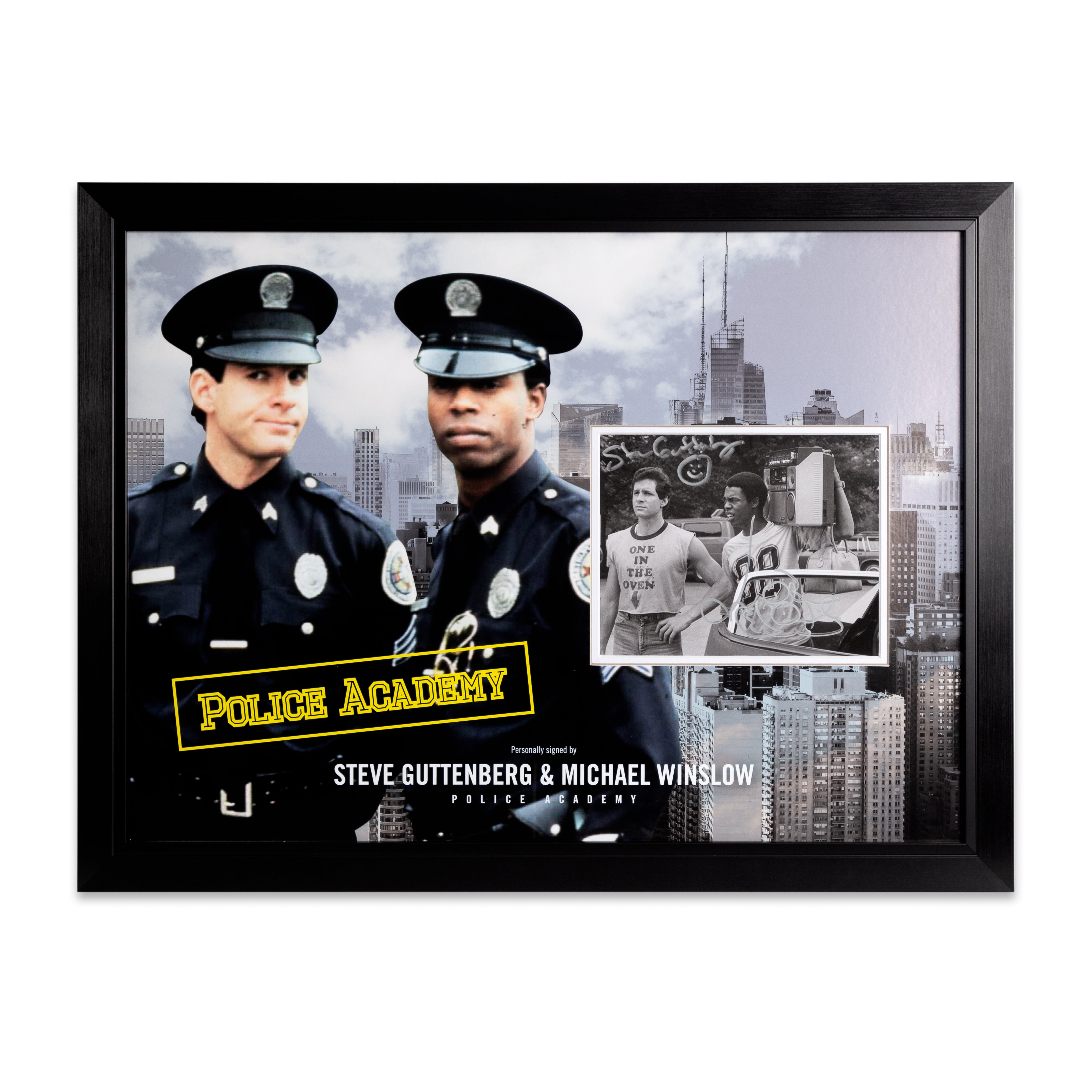 This stunning "Police Academy" picture, hand signed by Steve Guttenberg and Michael Winslow, is mounted on a custom-made picture board display which is designed in-house by our design team, and finished off in a stylish and modern bespoke black with black trim frame, making it a timeless addition to any home or office.