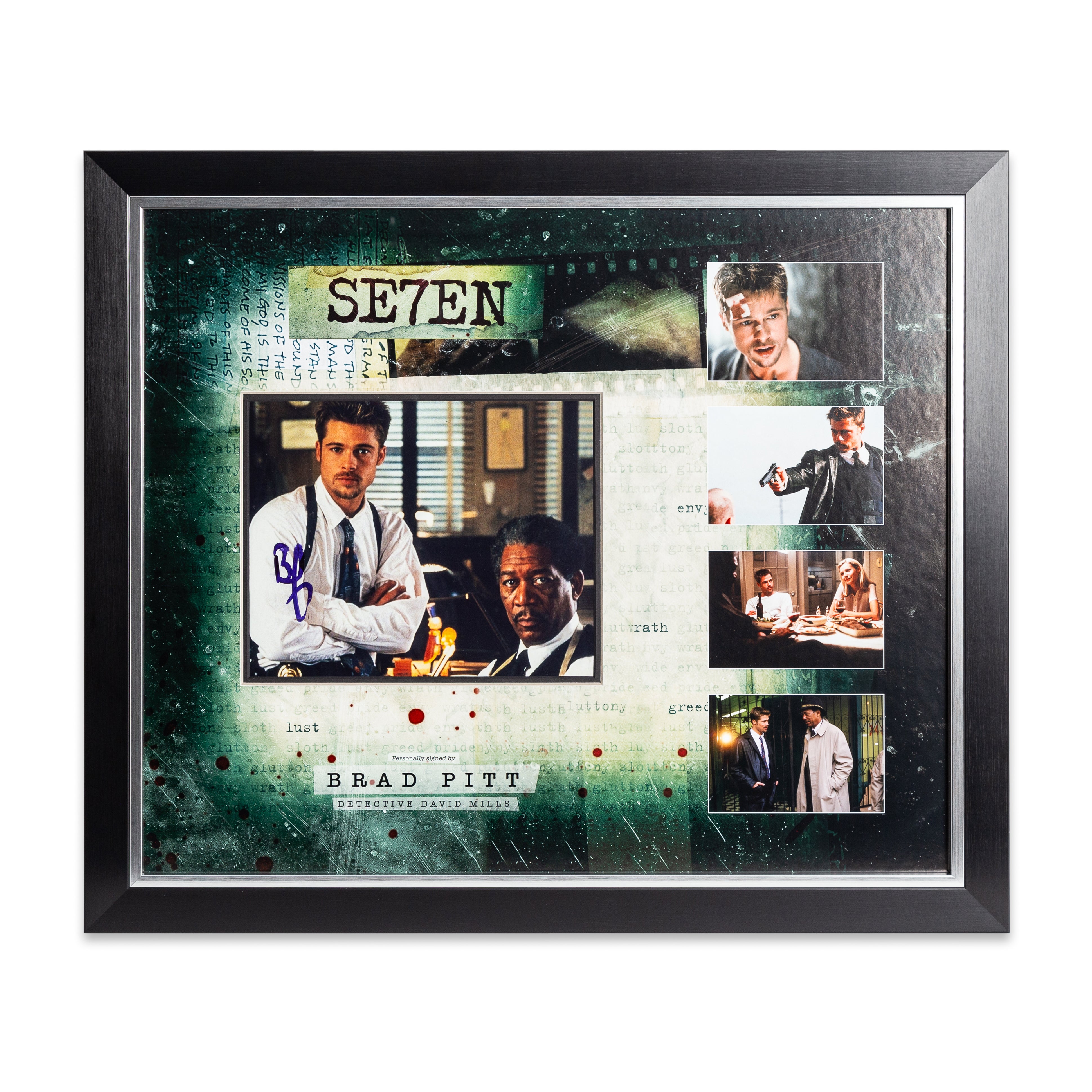 This stunning "Se7en" picture, hand signed by Brad Pitt , is mounted on a custom-made picture board display which is designed in-house by our design team, and finished off in a stylish and modern bespoke black with silver trim frame, making it a timeless addition to any home or office.