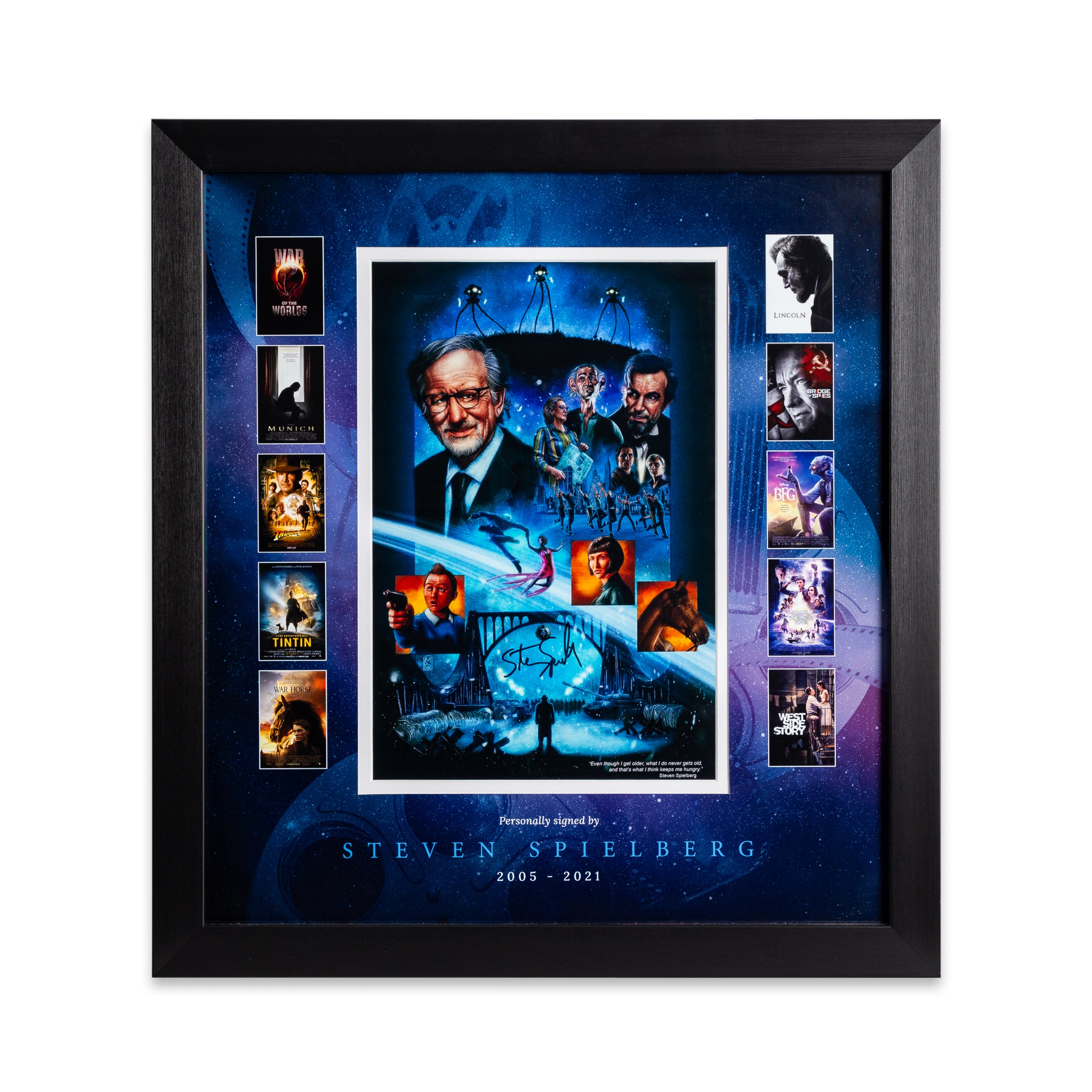 This stunning "Montage Frame" picture, hand signed by Steven Spielberg, is mounted on a custom-made picture board display which is designed in-house by our design team, and finished off in a stylish and modern bespoke black frame, making it a timeless addition to any home or office.