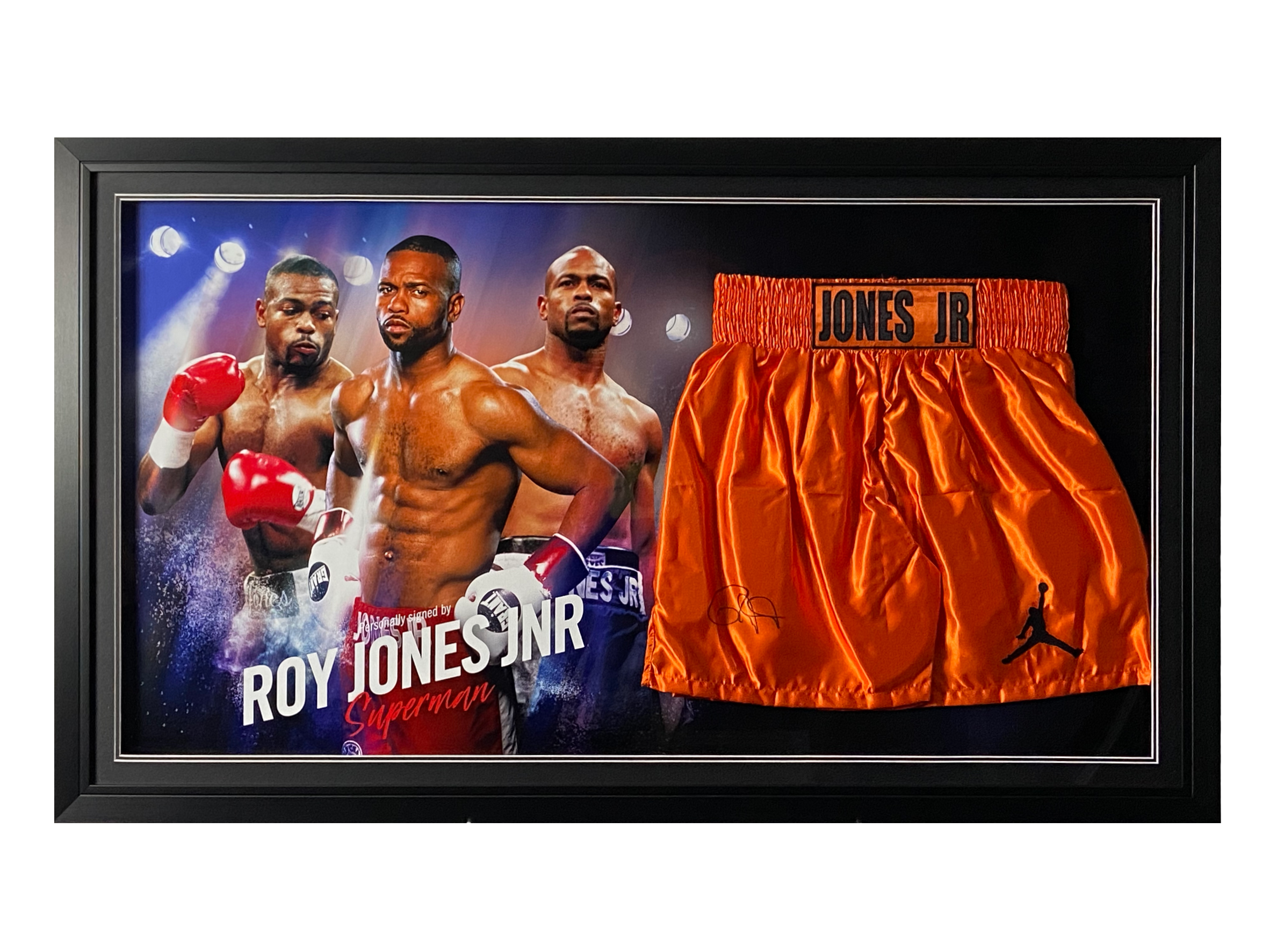 These stunning replica Shorts hand signed by Roy Jones Jnr, is made with a frame and picture collection which is designed in-house by our design team, and finished off in a stylish and modern bespoke black and silver trim frame, making it a timeless addition to any home or office.