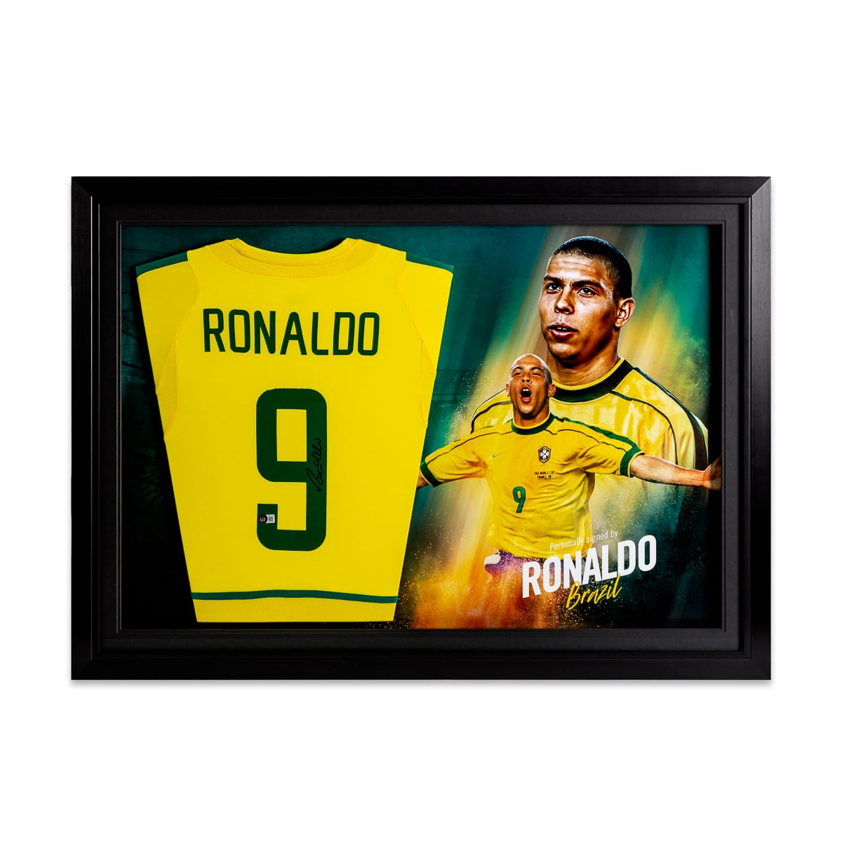 This stunning replica shirt hand signed by Ronaldo Nazario (R9), has been attached to a custom-made picture board display which is designed in-house by our design team and finished off in a stylish and modern bespoke white with silver trim frame. LED Lights have also been incorporated within the frame making it a timeless addition to any home or office.