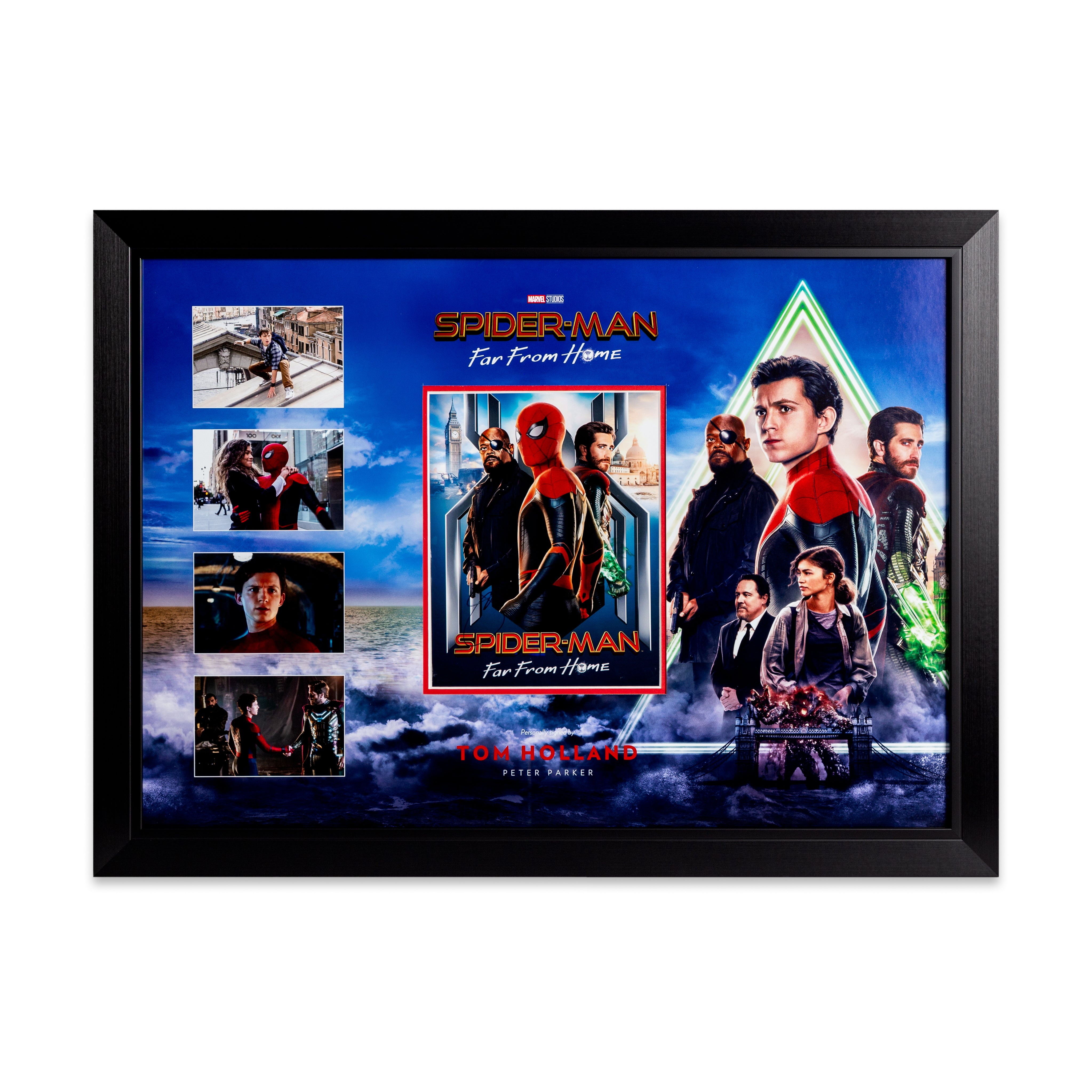 This stunning "Spiderman - Far From Home" picture, hand signed by Tom Holland, is mounted on a custom-made picture board display which is designed in-house by our design team, and finished off in a stylish and modern bespoke black on black trim frame, making it a timeless addition to any home or office.