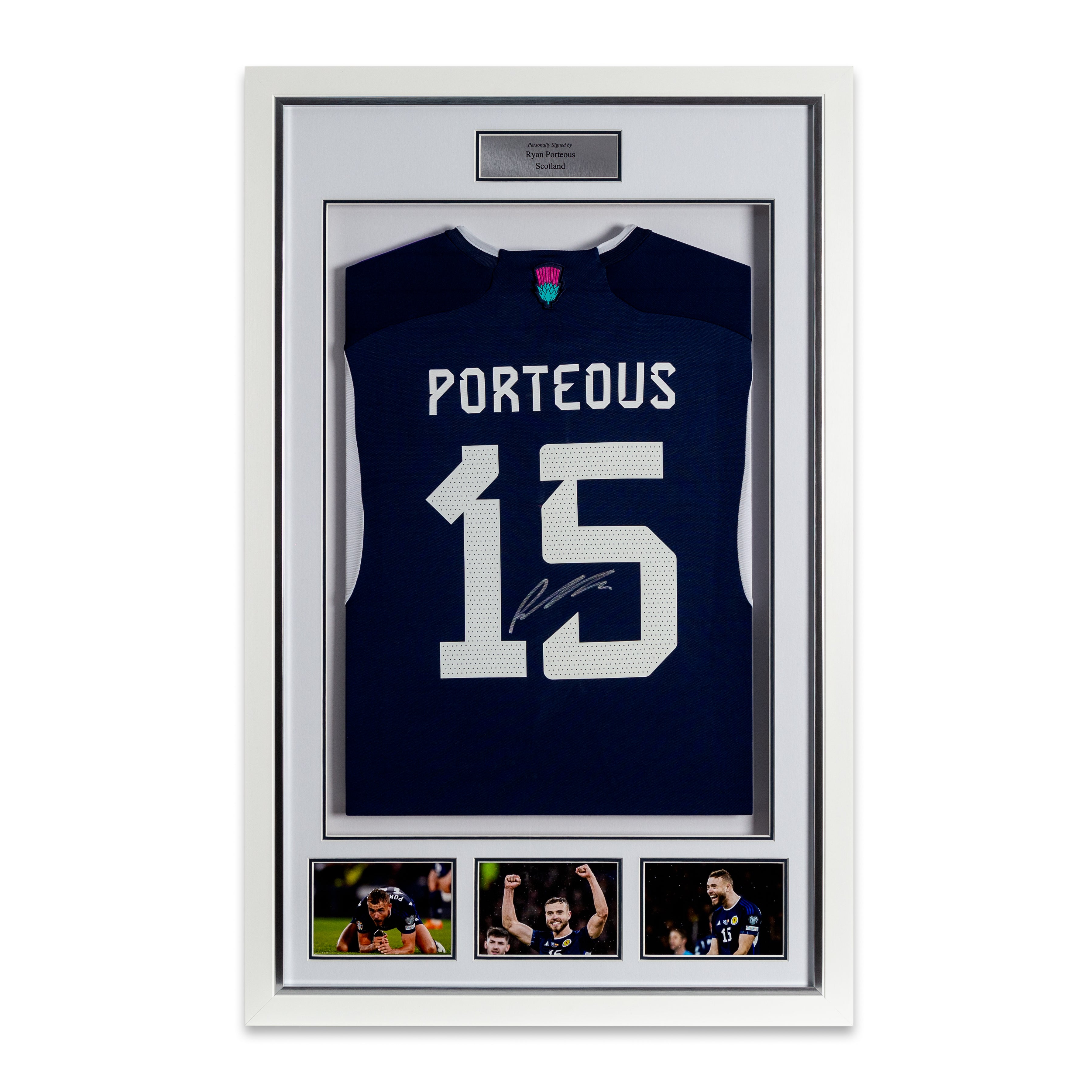 This stunning replica shirt has been hand signed by Ryan Porteous. Framed sponsor style, our most popular shirt finish, with 3 pictures and a silver plaque then finished off in a stylish and modern bespoke white with silver trim frame, making it a timeless addition to any home or office.