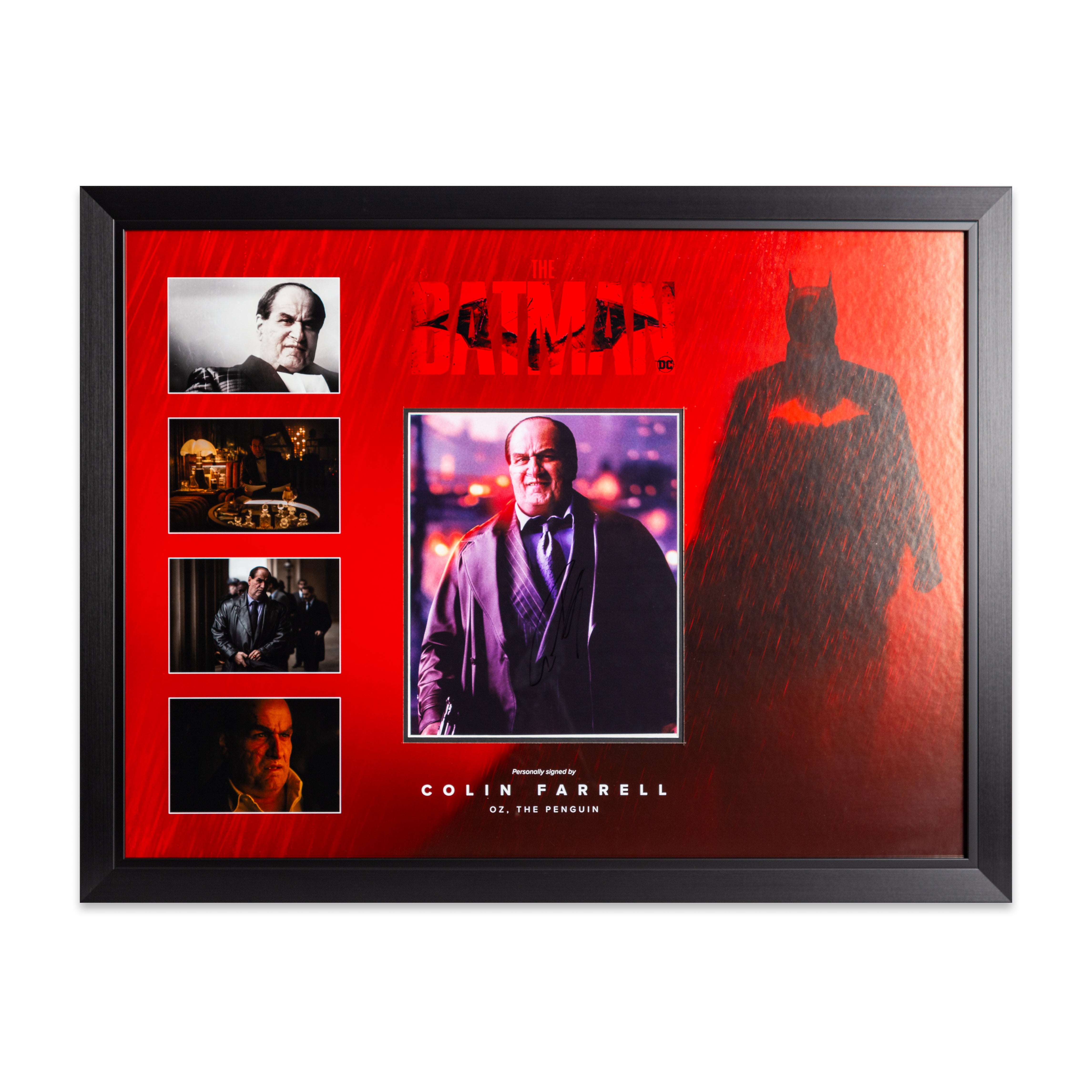 This stunning "The Batman" picture, hand signed by Colin Farrell, is mounted on a custom-made picture board display which is designed in-house by our design team, and finished off in a stylish and modern bespoke black with black trim frame, making it a timeless addition to any home or office.
