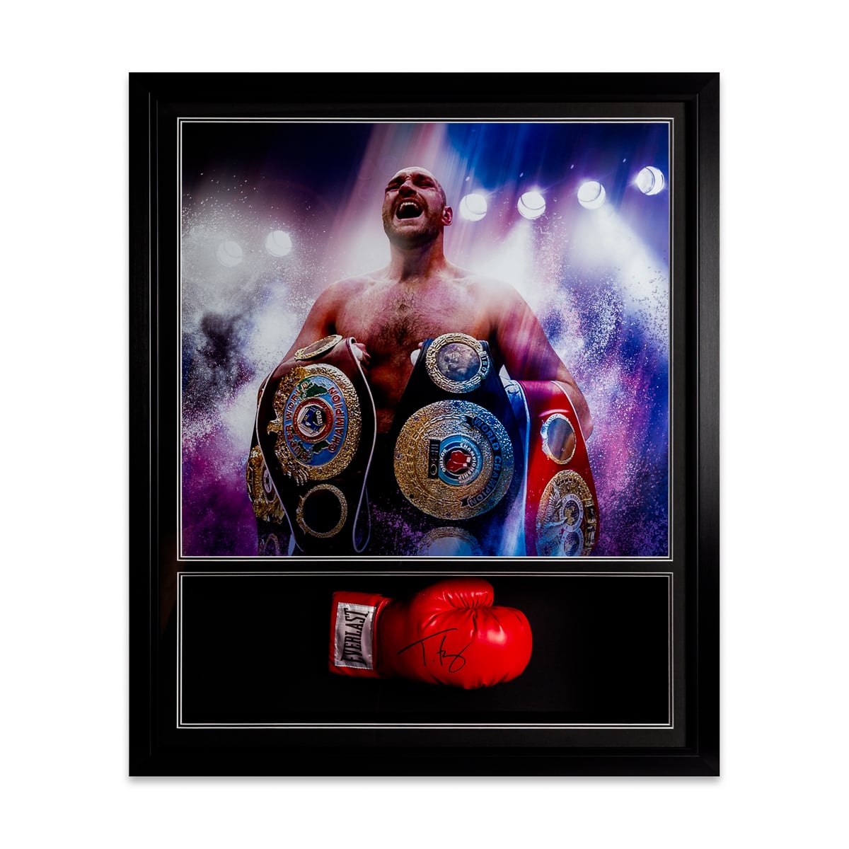 This Stunning Replica glove, Hand Signed by Tyson Fury, is made with a frame and picture collection which is designed in-house by our design team, and finished off in a stylish and modern bespoke black on black trim frame, making it a timeless addition to any home or office.