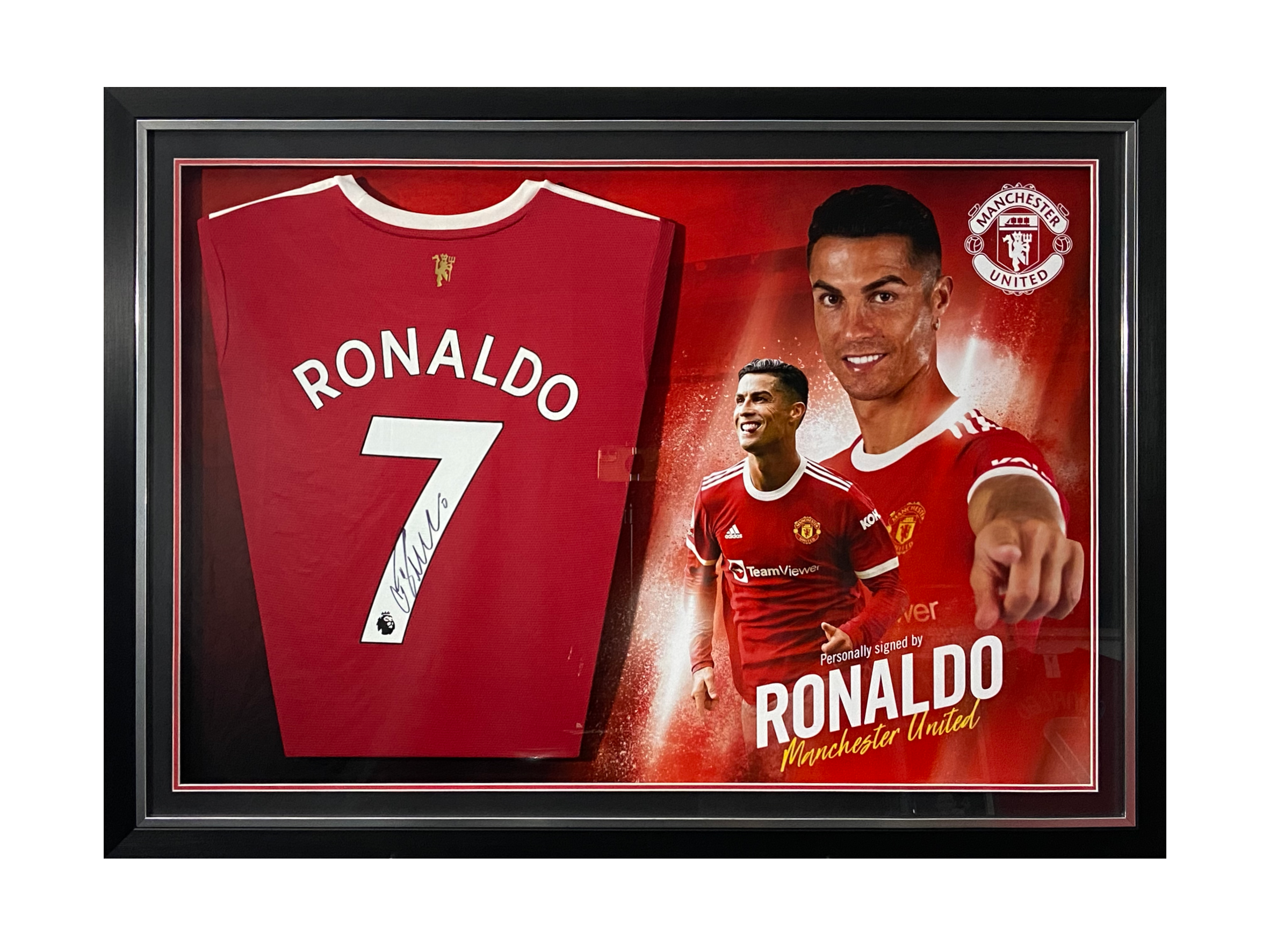 This stunning replica shirt hand signed by Ronaldo, has been attached to a custom-made picture board display which is designed in-house by our design team and finished off in a stylish and modern bespoke black with silver trim frame. LED Lights have also been incorporated within the frame making it a timeless addition to any home or office.