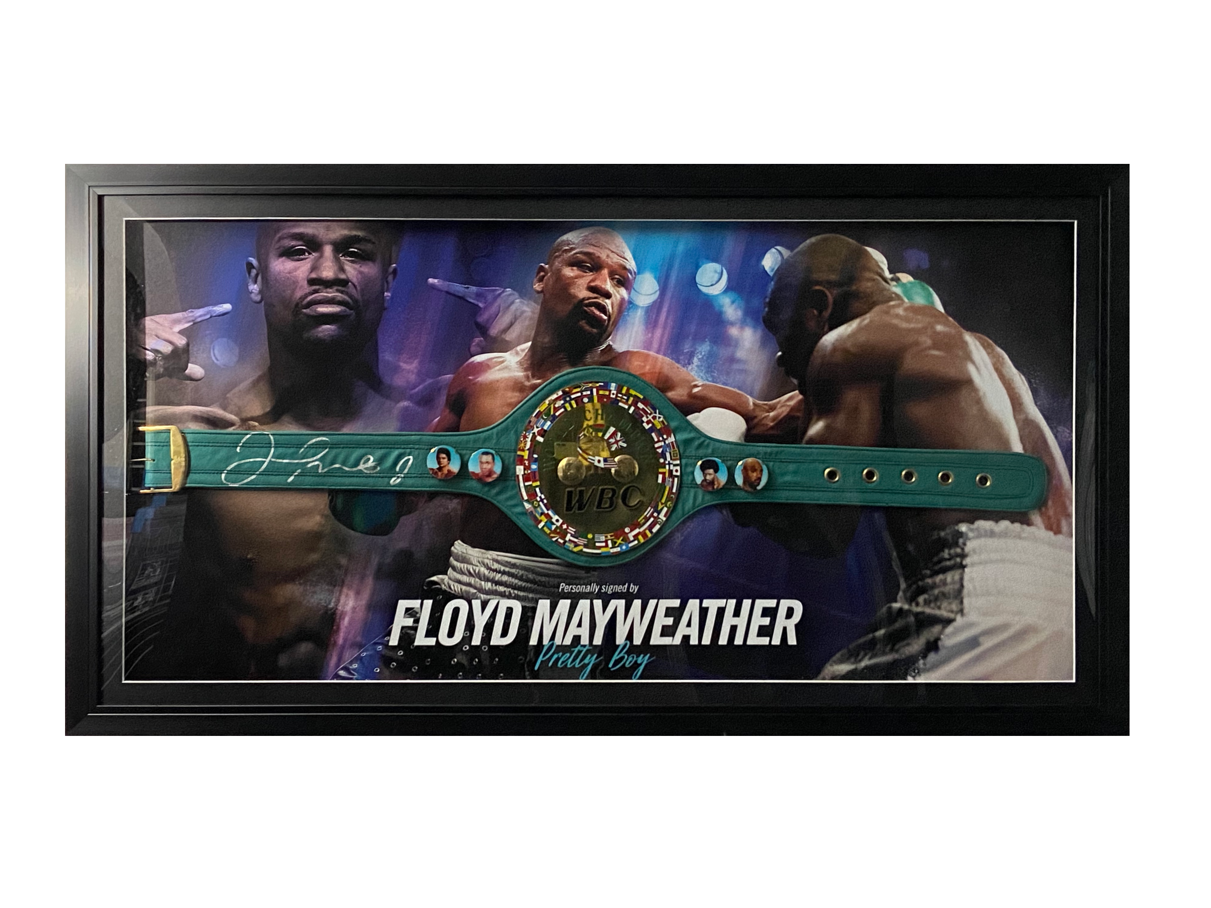 This stunning replica belt hand signed by Floyd Mayweather, is made with a namecut and picture collection which is designed in-house by our design team, and finished off in a stylish and modern bespoke black and silver trim frame, making it a timeless addition to any home or office.