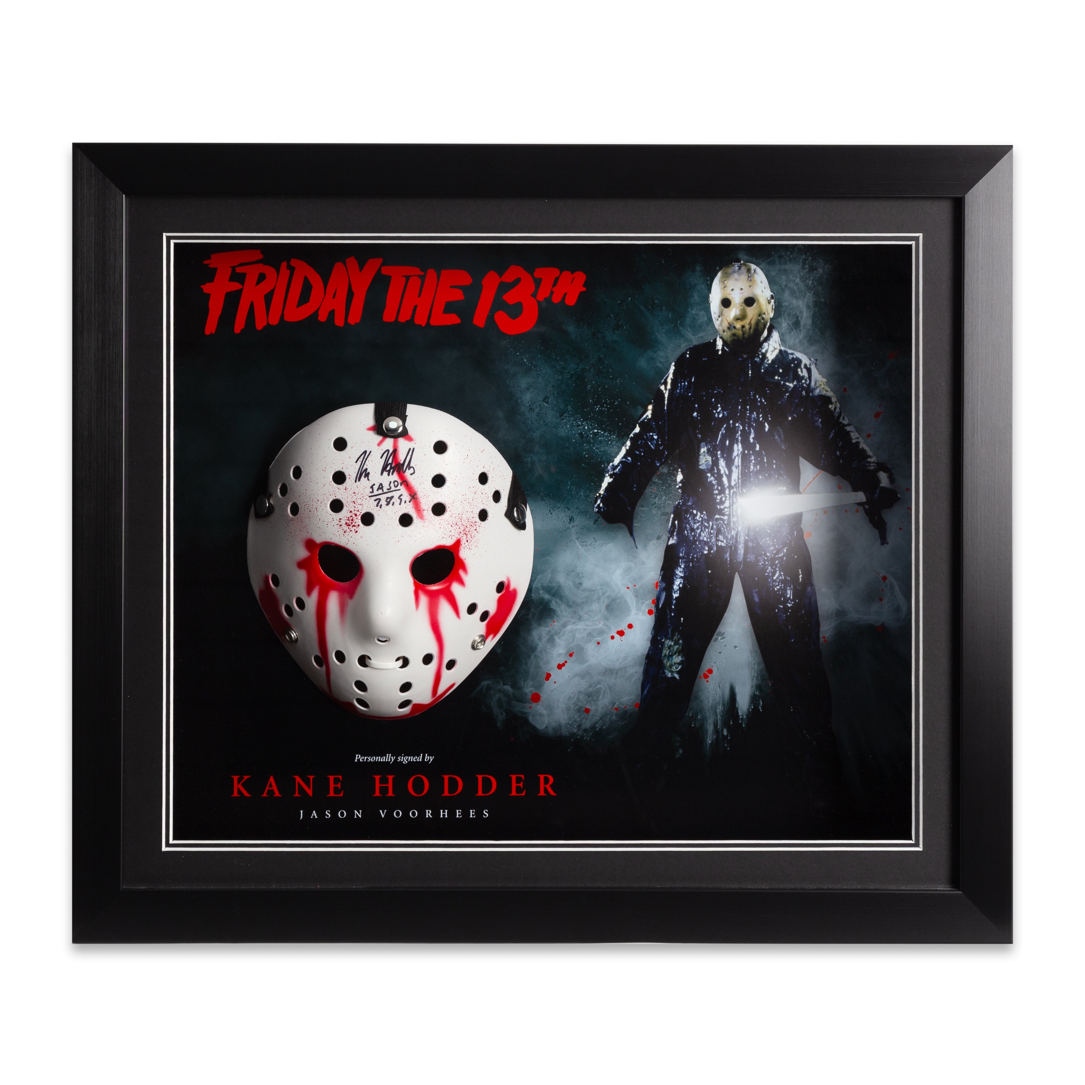 This stunning "Friday 13th " Jason Mask, hand signed by Kane Hodder, is mounted on a custom-made picture board display which is designed in-house by our design team, and finished off in a stylish and modern bespoke black with red trim frame, making it a timeless addition to any home or office.