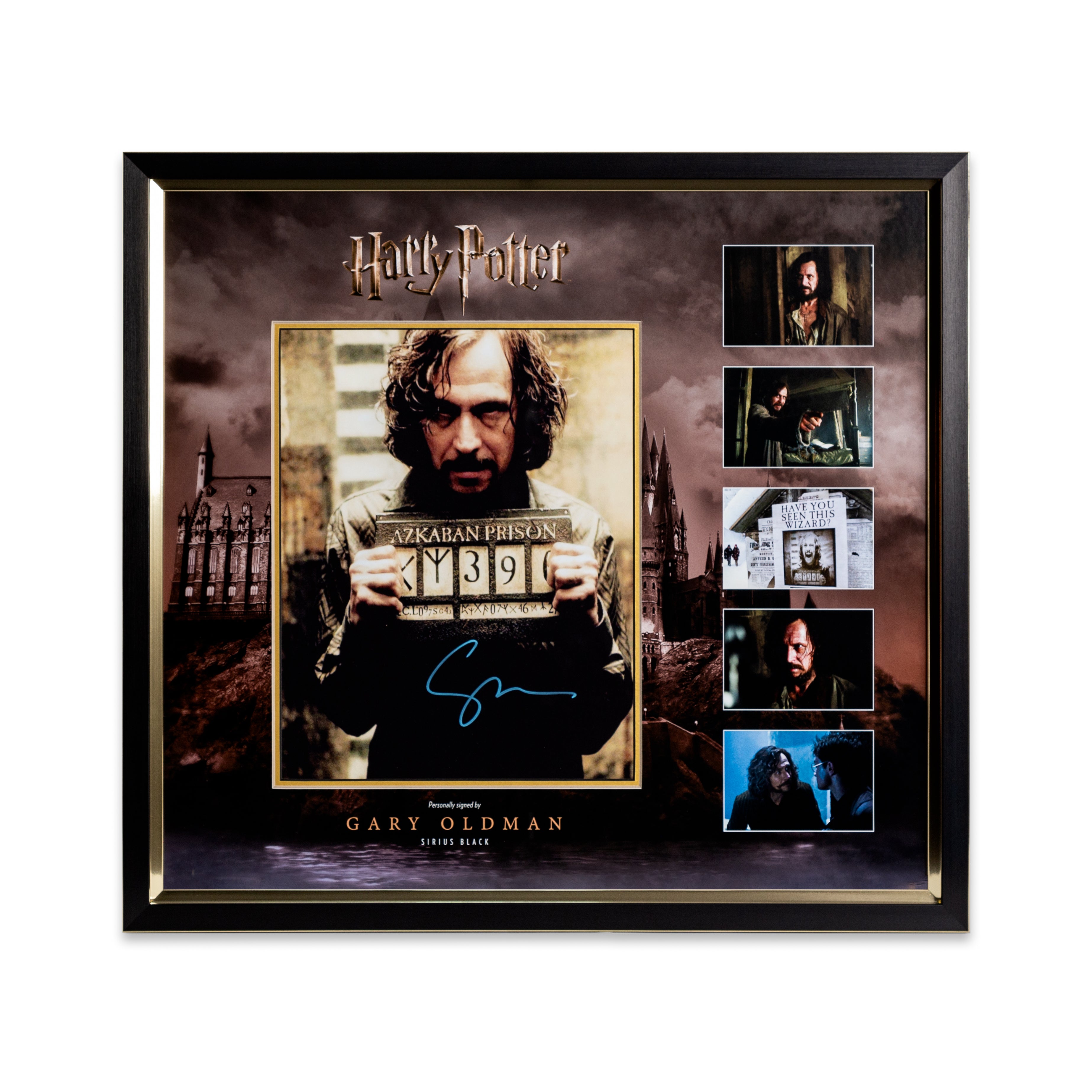 This stunning "Harry Potter" picture, hand signed by Gary Oldman, is mounted on a custom-made picture board display which is designed in-house by our design team, and finished off in a stylish and modern bespoke black with gold trim frame, making it a timeless addition to any home or office.