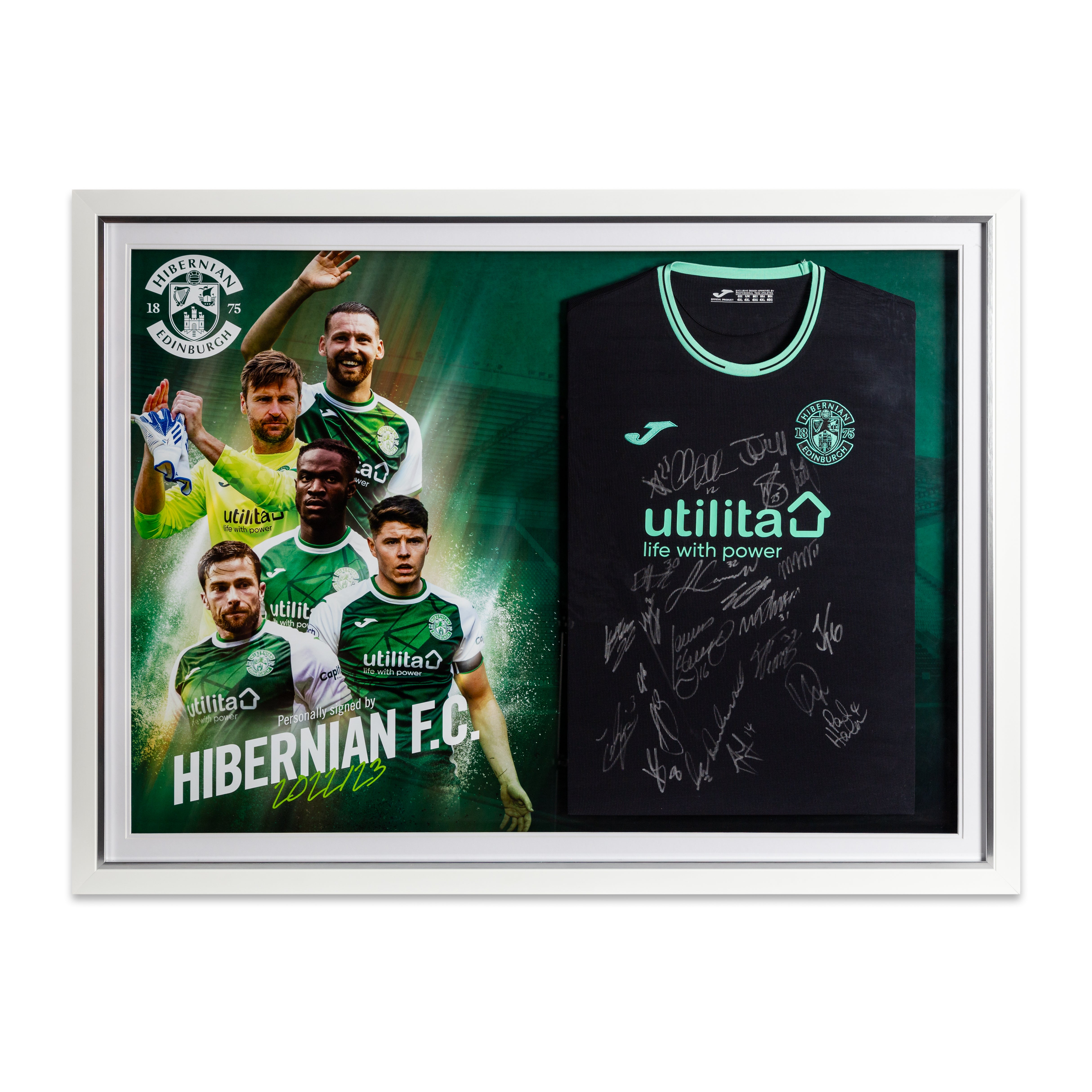 This stunning replica Shirt hand signed by The Hibs Squad , This Picture Board Display is made with a frame and picture collection which is designed in-house by our design team, and finished off in a stylish and modern bespoke black and silver trim frame, making it a timeless addition to any home or office.
