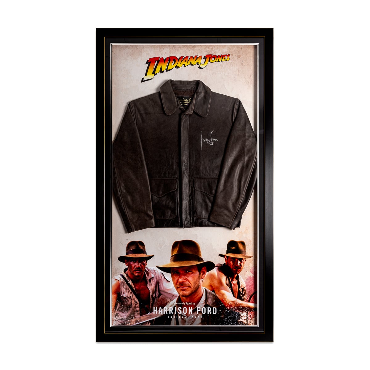This stunning replica Indiana Jones Jacket hand signed by Harrison Ford, has been attached to a custom-made picture board display which is designed in-house by our design team and finished off in a stylish and modern bespoke Black with Gold trim frame. LED Lights have also been incorporated within the frame making it a timeless addition to any home or office.
