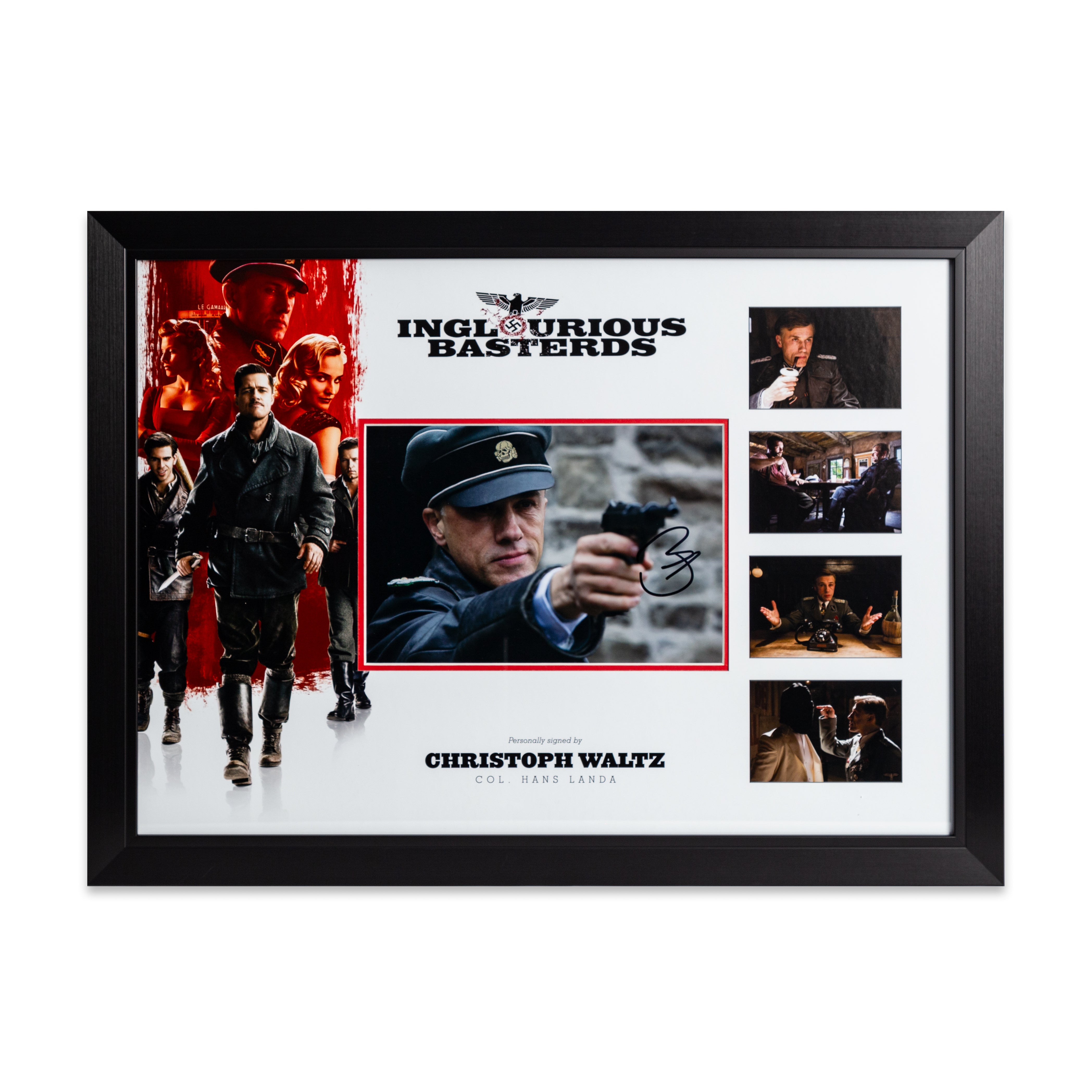 This stunning "Inglourious Basterds" picture, hand signed by Christopher Waltz, is mounted on a custom-made picture board display which is designed in-house by our design team, and finished off in a stylish and modern bespoke black with black trim frame, making it a timeless addition to any home or office.