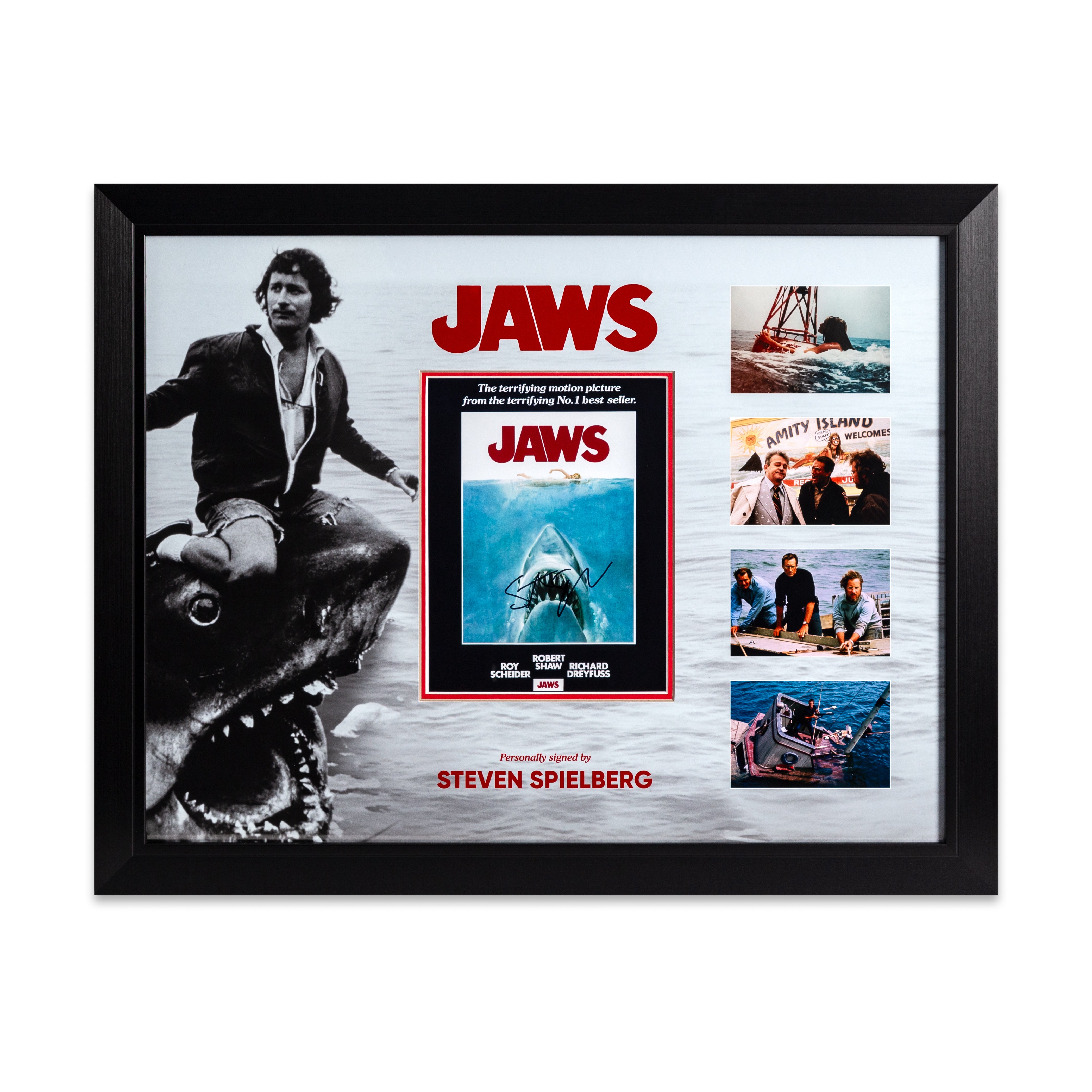 This stunning "Jaws" Picture , hand signed by Steven Spielberg, is mounted on a custom-made picture board display which is designed in-house by our design team, and finished off in a stylish and modern bespoke black frame, making it a timeless addition to any home or office.
