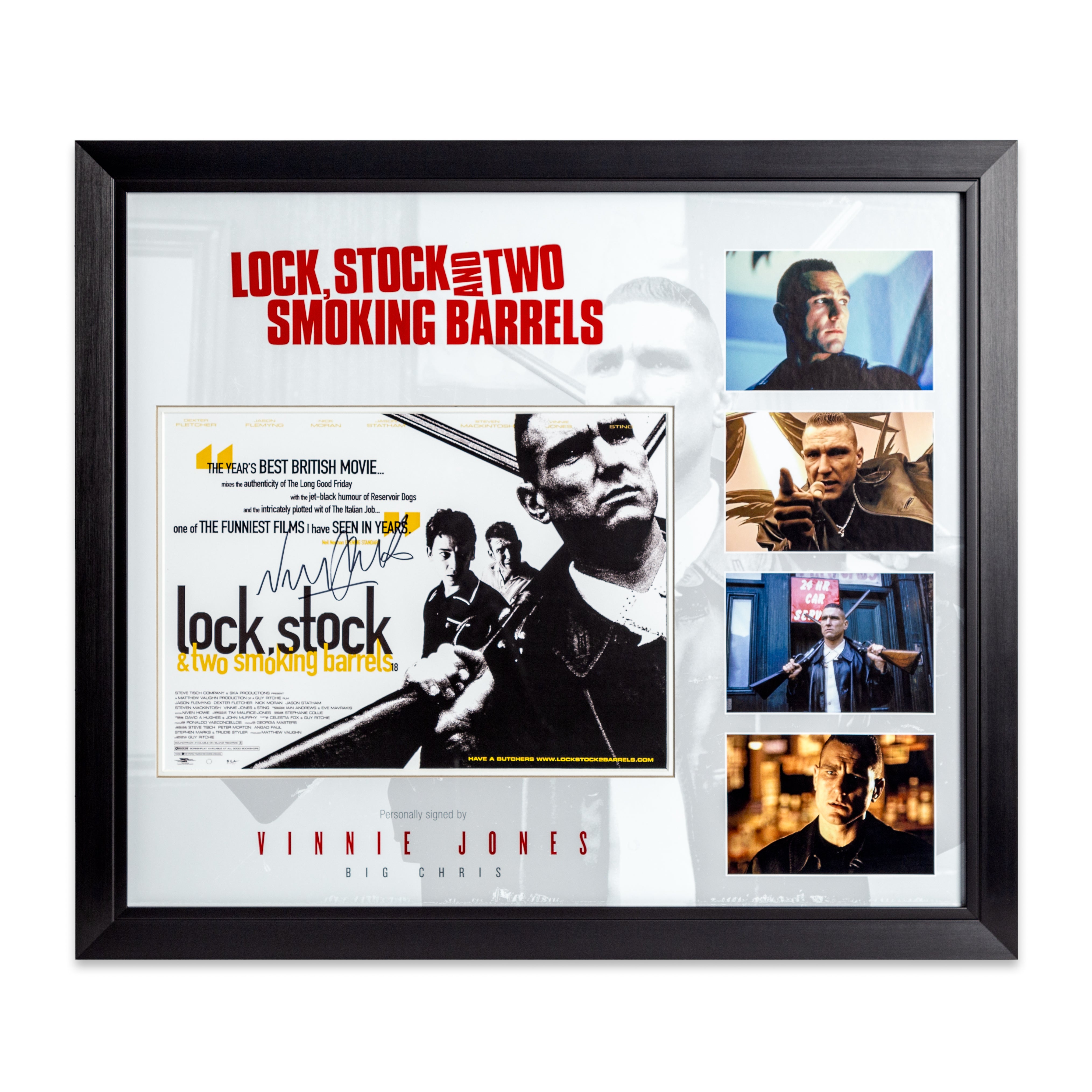 This stunning "Lock, Stock and Two Smoking Barrels" picture, hand signed by Vinnie Jones, is mounted on a custom-made picture board display which is designed in-house by our design team, and finished off in a stylish and modern bespoke black with black trim frame, making it a timeless addition to any home or office.