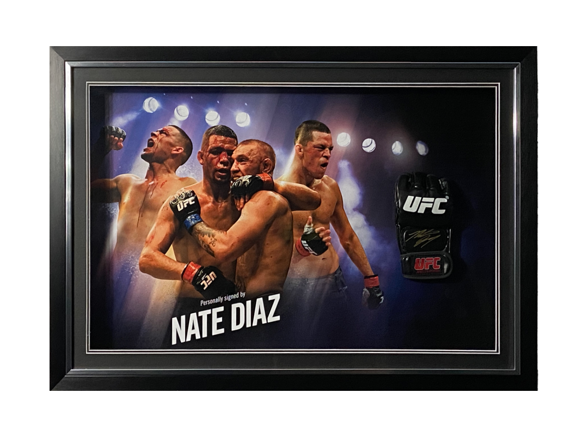 This stunning replica UFC mitt, hand signed by Nate Diaz, is mounted on a custom-made picture board display which is designed in-house by our design team, and finished off in a stylish and modern bespoke black and black trim frame, making it a timeless addition to any home or office.