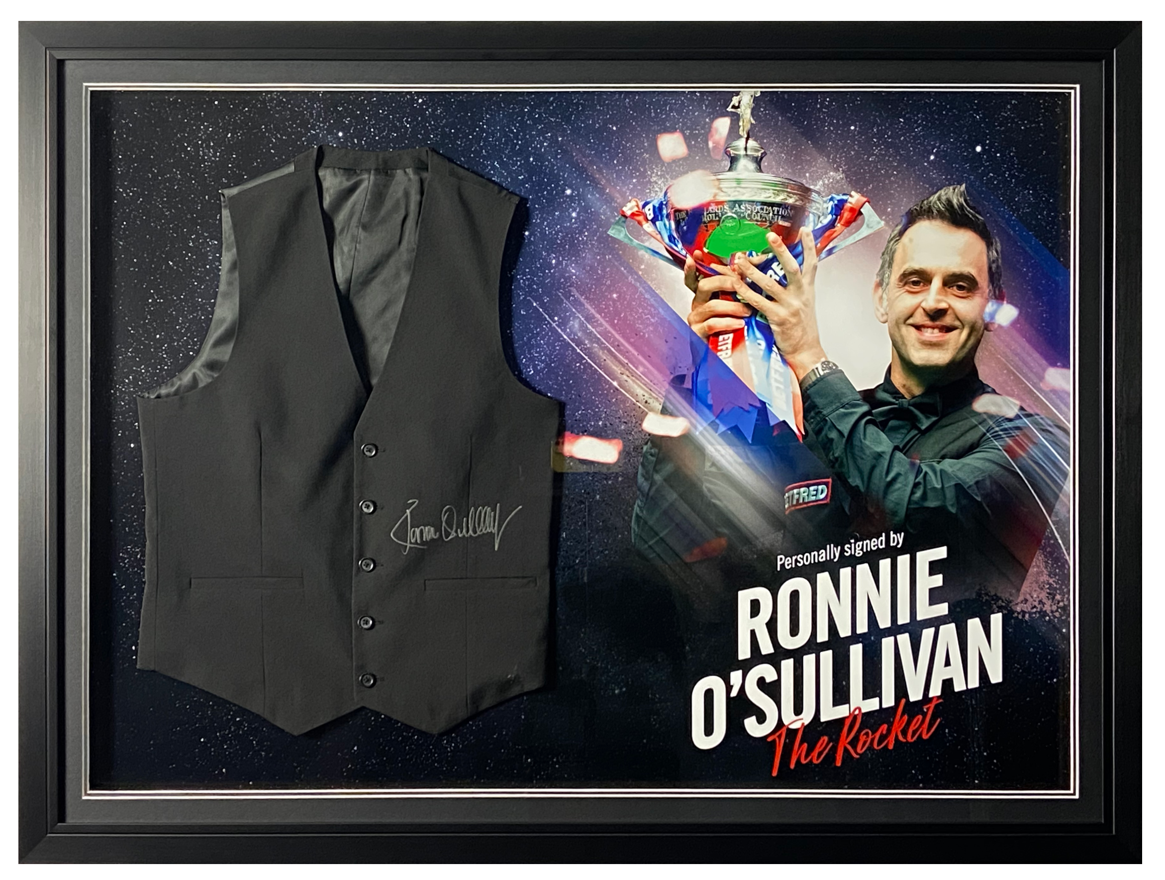 This stunning waistcoat display Hand Signed by Ronnie O'Sullivan, is made with a frame and plaque which is designed in-house by our design team, and finished off in a stylish and modern bespoke black and silver trim frame, making it a timeless addition to any home or office.
