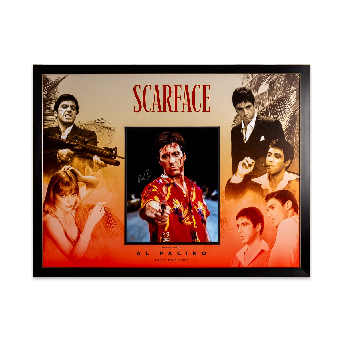 This stunning "Scarface" picture, hand signed by Al Pacino, is mounted on a custom-made picture board display which is designed in-house by our design team, and finished off in a stylish and modern bespoke black with gold outline frame, making it a timeless addition to any home or office.