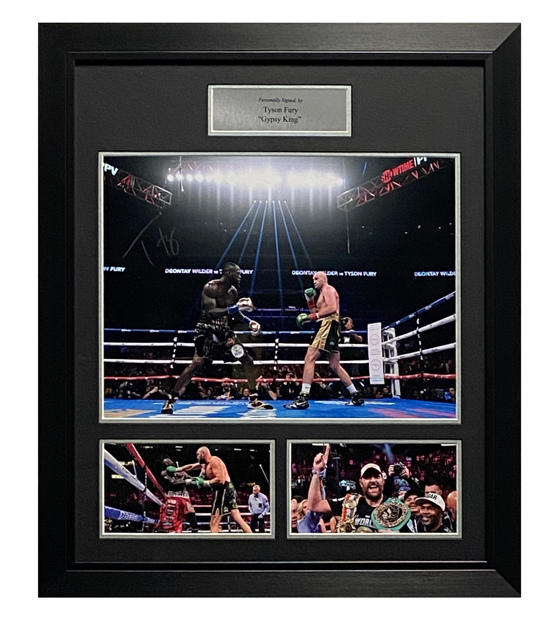 This stunning picture, hand signed by Tyson Fury, has been mounted with 2 pictures and a plaque , and finished off in a stylish and modern bespoke black with black trim, making it a timeless addition to any home or office.