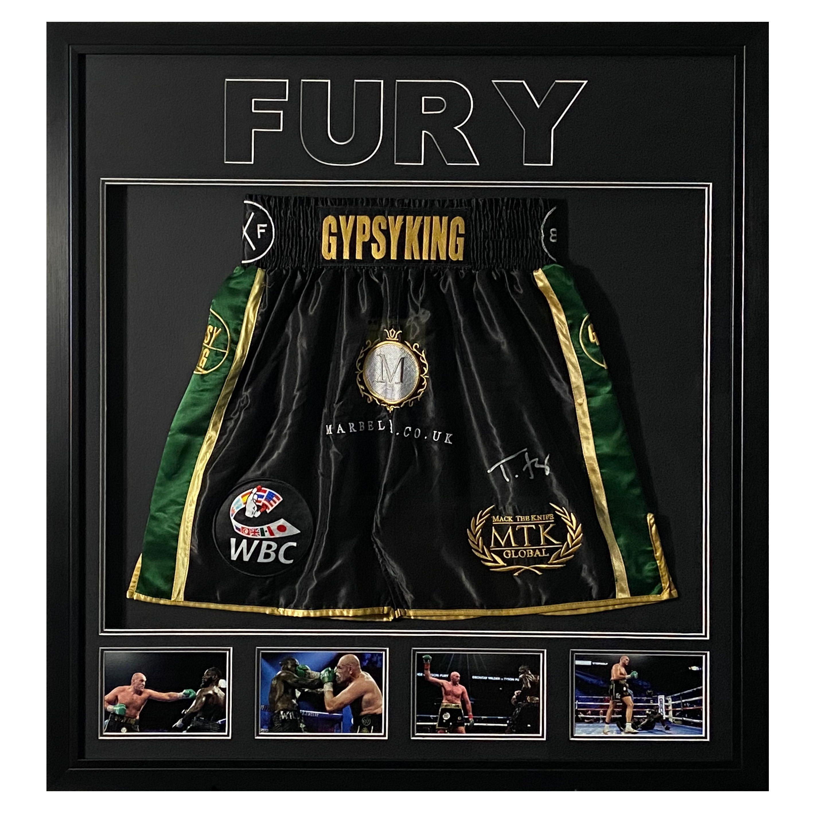 These stunning replica shorts, hand signed by Tyson Fury, is mounted on a custom-made picture board with a plaque display and picture collection which is designed in-house by our design team, and finished off in a stylish and modern bespoke black and silver trim frame, making it a timeless addition to any home or office.