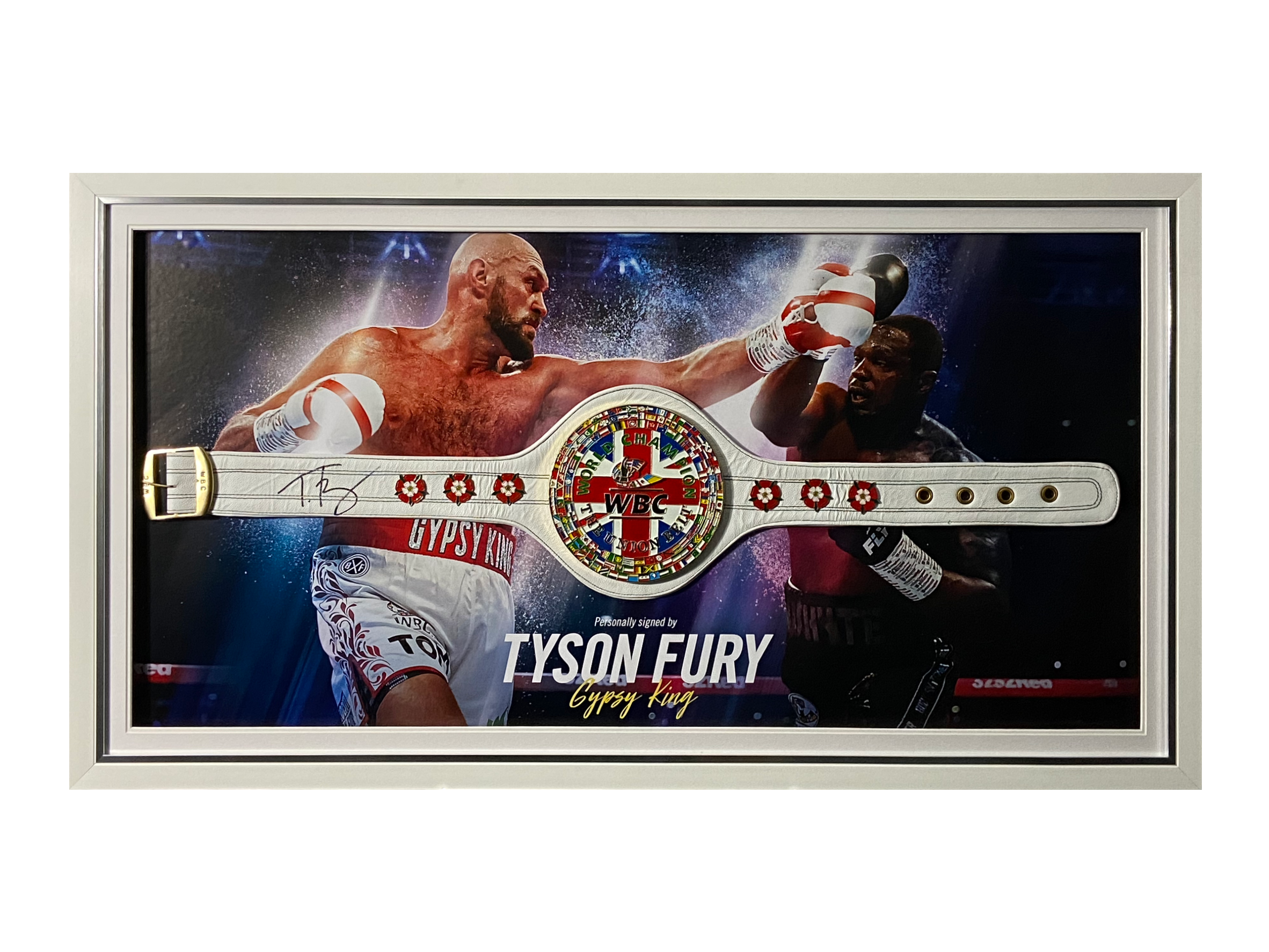 This stunning replica WBC belt, hand signed by Tyson Fury, is mounted on a custom-made picture board display which is designed in-house by our design team, and finished off in a stylish and modern bespoke white with silver trim frame, making it a timeless addition to any home or office.
